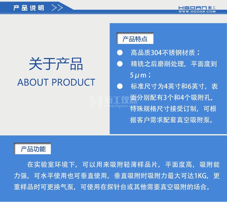 衡工真空卡盤,在實(shí)驗(yàn)室環(huán)境下,可用來吸附輕薄樣品片,平面度高,吸附能力強(qiáng),可水平使用,也可垂直使用,垂直吸附時(shí)吸附力最大可達(dá)1KG,更重樣品是可更換氣泵,可使用在探針臺(tái)或其他需要吸附的場(chǎng)合。