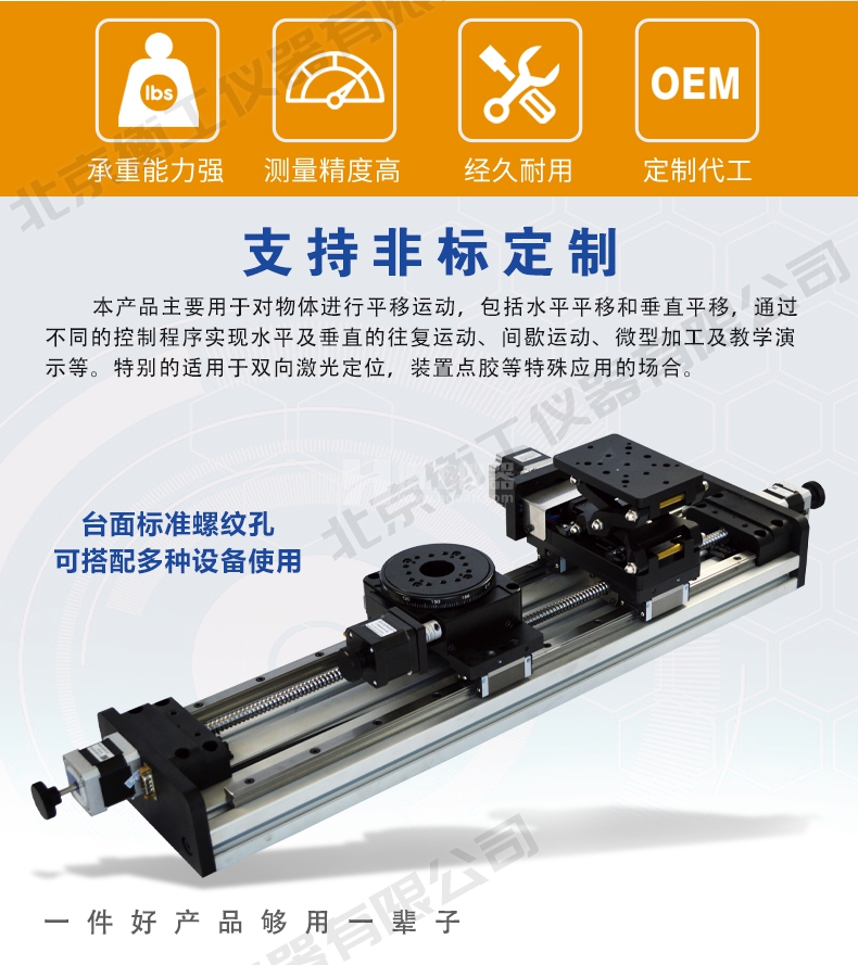 本產(chǎn)品主要用于對(duì)物體進(jìn)行平移運(yùn)動(dòng),包括水平平移和垂直平移,通過(guò)不同的控制程序?qū)崿F(xiàn)水平及垂直的往復(fù)運(yùn)動(dòng)、間歇運(yùn)動(dòng)、微型加工及教學(xué)演示等。特別的適用于雙向激光定位,裝置點(diǎn)膠等特殊應(yīng)用的場(chǎng)合。