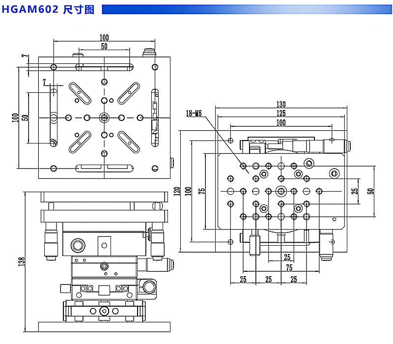 ● 上下部均有標(biāo)準(zhǔn)孔距的連接孔,方便與其他位移臺(tái)連接,組成多維移動(dòng)臺(tái)。